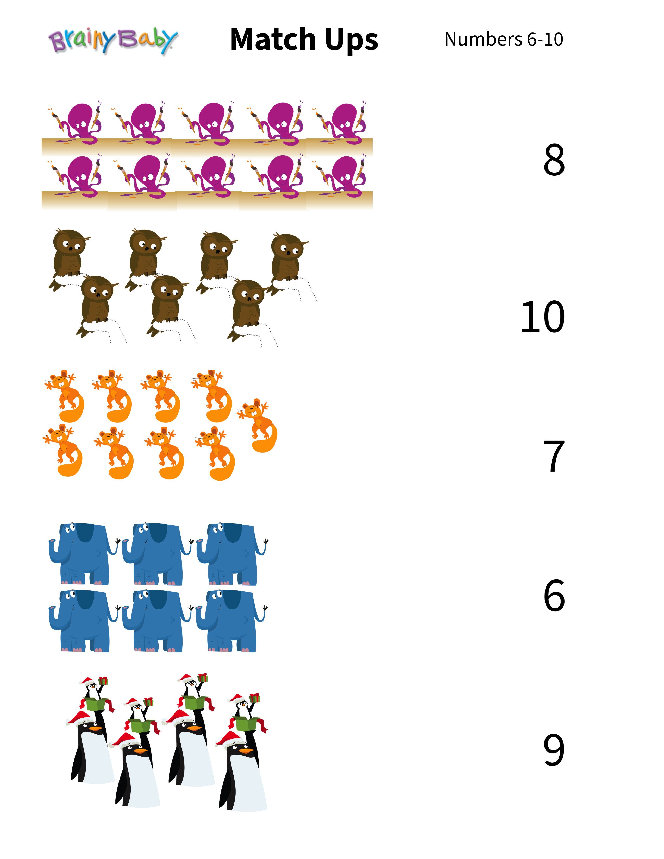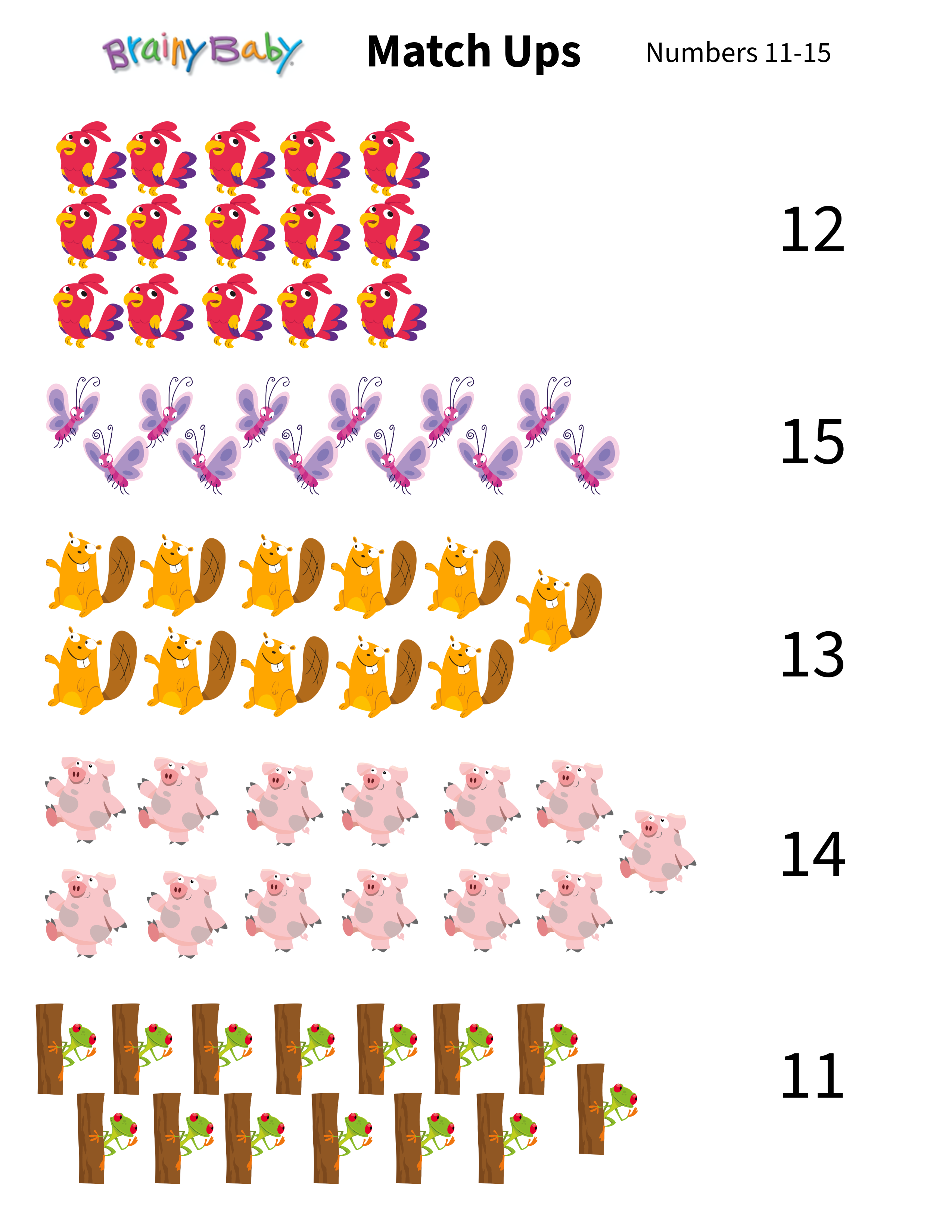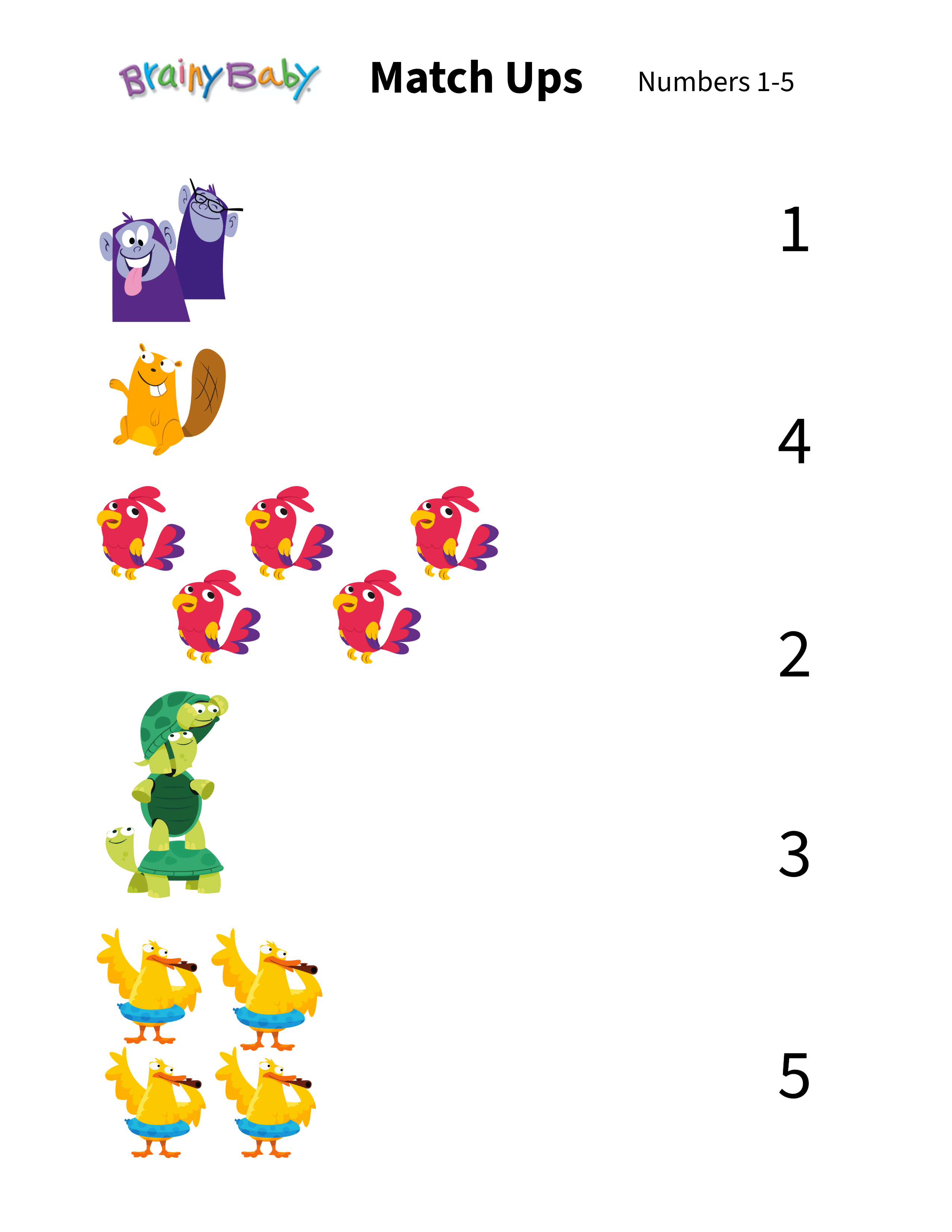 Brainy Baby® Match Ups! Colorful Characters Numbers Activity Sheets can be downloaded and printed from home to help your child learn numbers 1 to 20. Easy and colorful Match Ups! printouts enhance your child's learning when used with Brainy Baby® 123s Board Book, 123s Flashcards, 123s Snap Card Game, and 123s Video to help keep your child engaged. They're free!